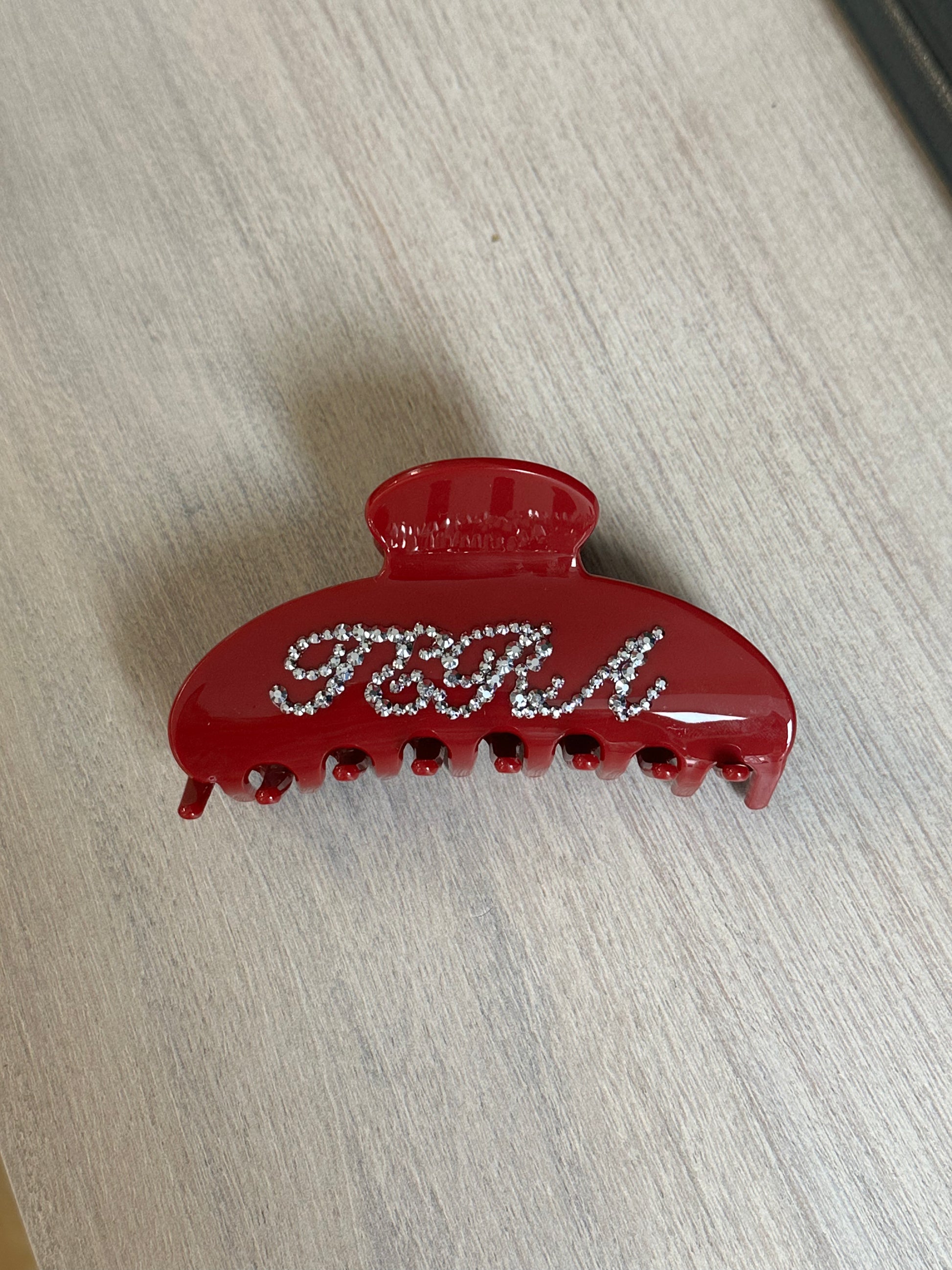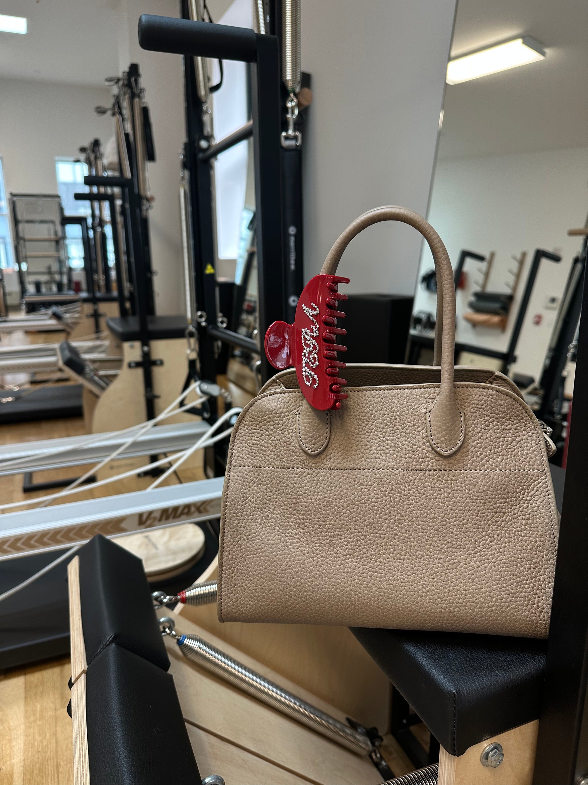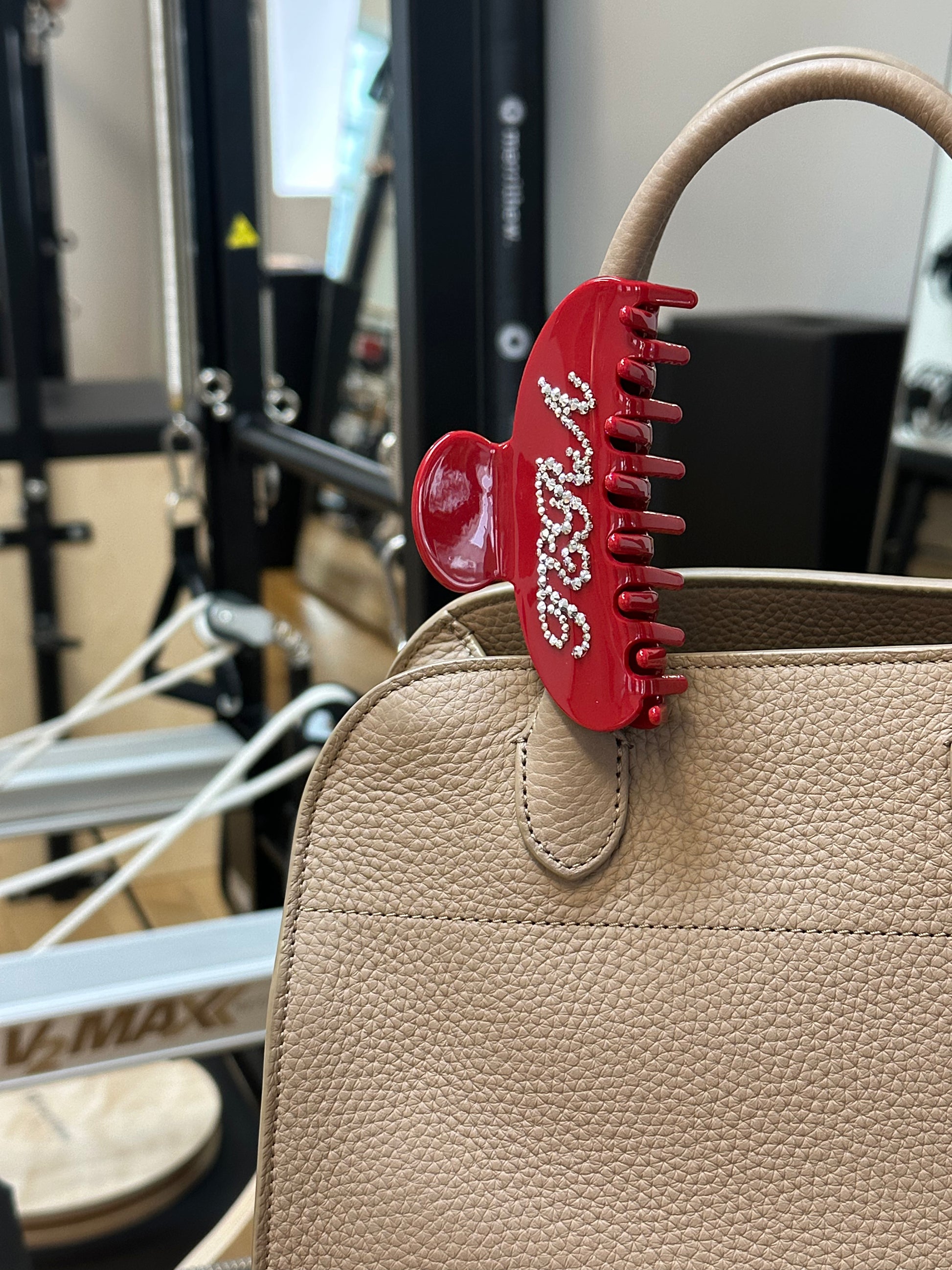 Our custom red claw clip is hand embellished in rhinestones and makes the perfect pilates accessory before, during, or after class.