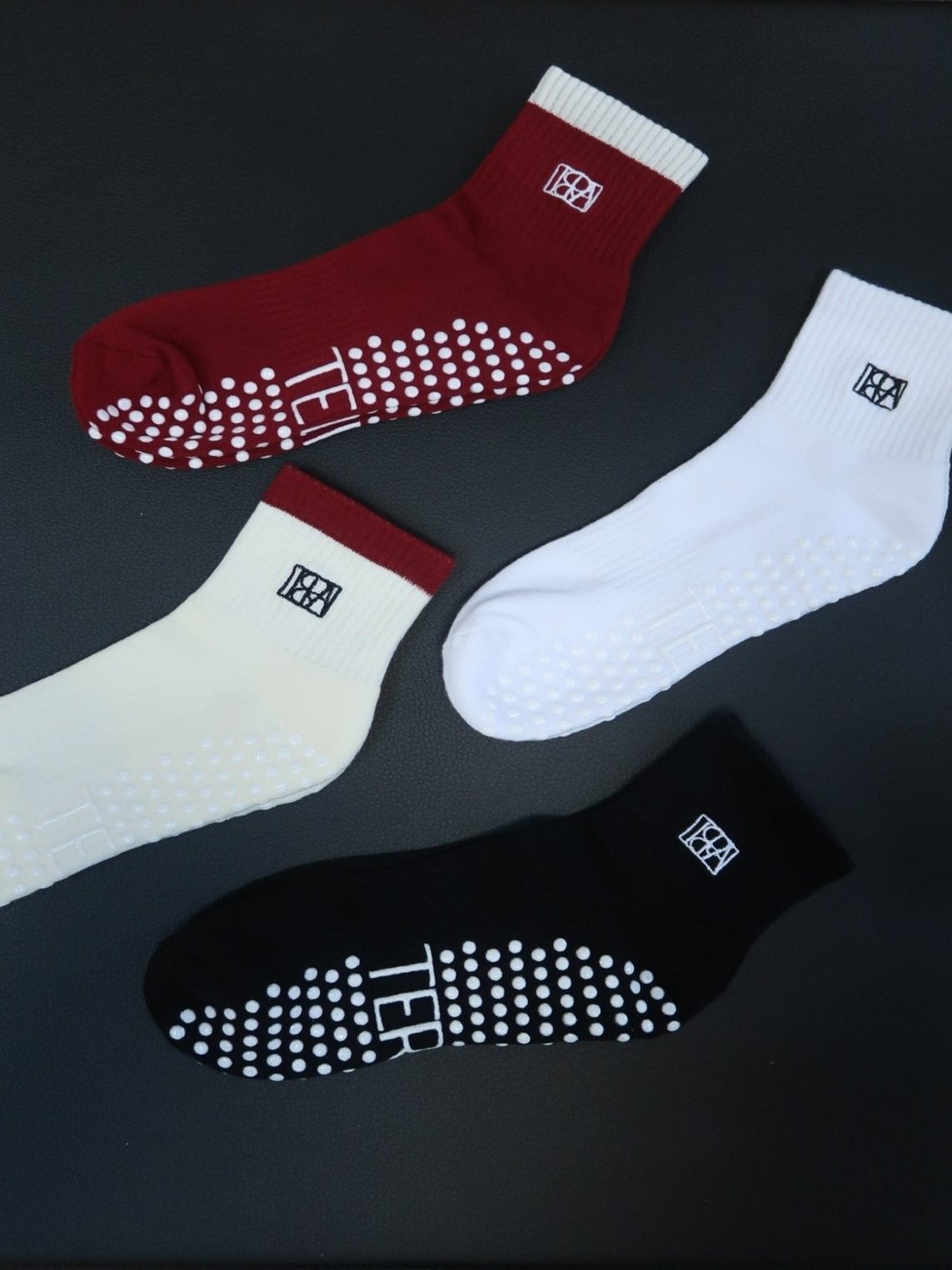 Introducing our first "TERA the Label." Product! Our signature sock includes our subtle, chic symbol on either side, with our classic label and full grips on the underside. These socks look good with your sneakers, loafers, and to all of your pre and post-pilates activities.